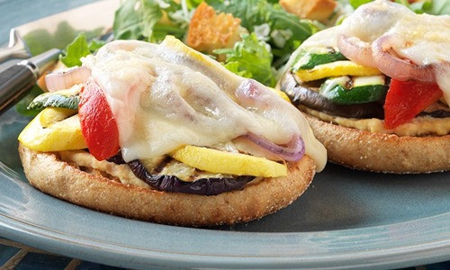Na kromkach chleba ułóż plasterki pomidora, podsmażone warzywa i starty ser
