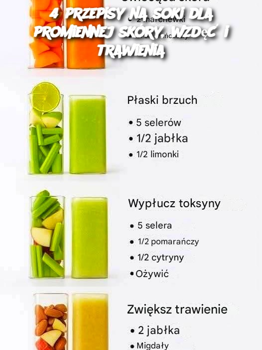 Oto 4 przepisy na soki, które mają na celu wspieranie promiennej skóry, redukcję wzdęć i poprawę trawienia. Każdy z nich zawiera naturalne, pełnowartościowe składniki bogate w witaminy, przeciwutleniacze i enzymy, które pomagają oczyścić organizm i odżywić skórę.