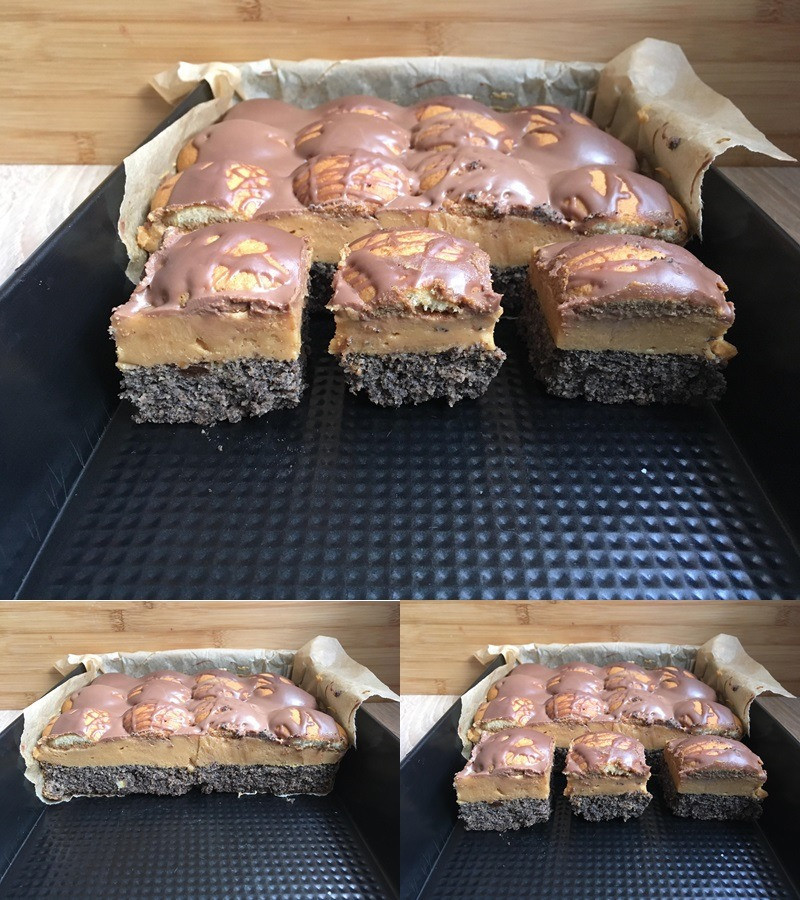 Składanie ciasta: Ostudzone ciasto makowe przekrój na dwie równe części. Na dolną część rozsmaruj równomiernie połowę kremu. Przykryj drugą częścią ciasta i rozsmaruj pozostały krem na wierzchu i po bokach.