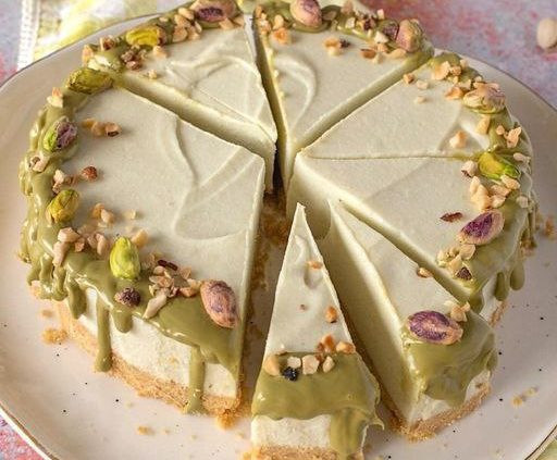 Dekoracja: Przed podaniem posyp ciasto obficie posiekanymi pistacjami. Możesz również udekorować świeżymi owocami, np. malinami, które świetnie kontrastują z pistacjami.
