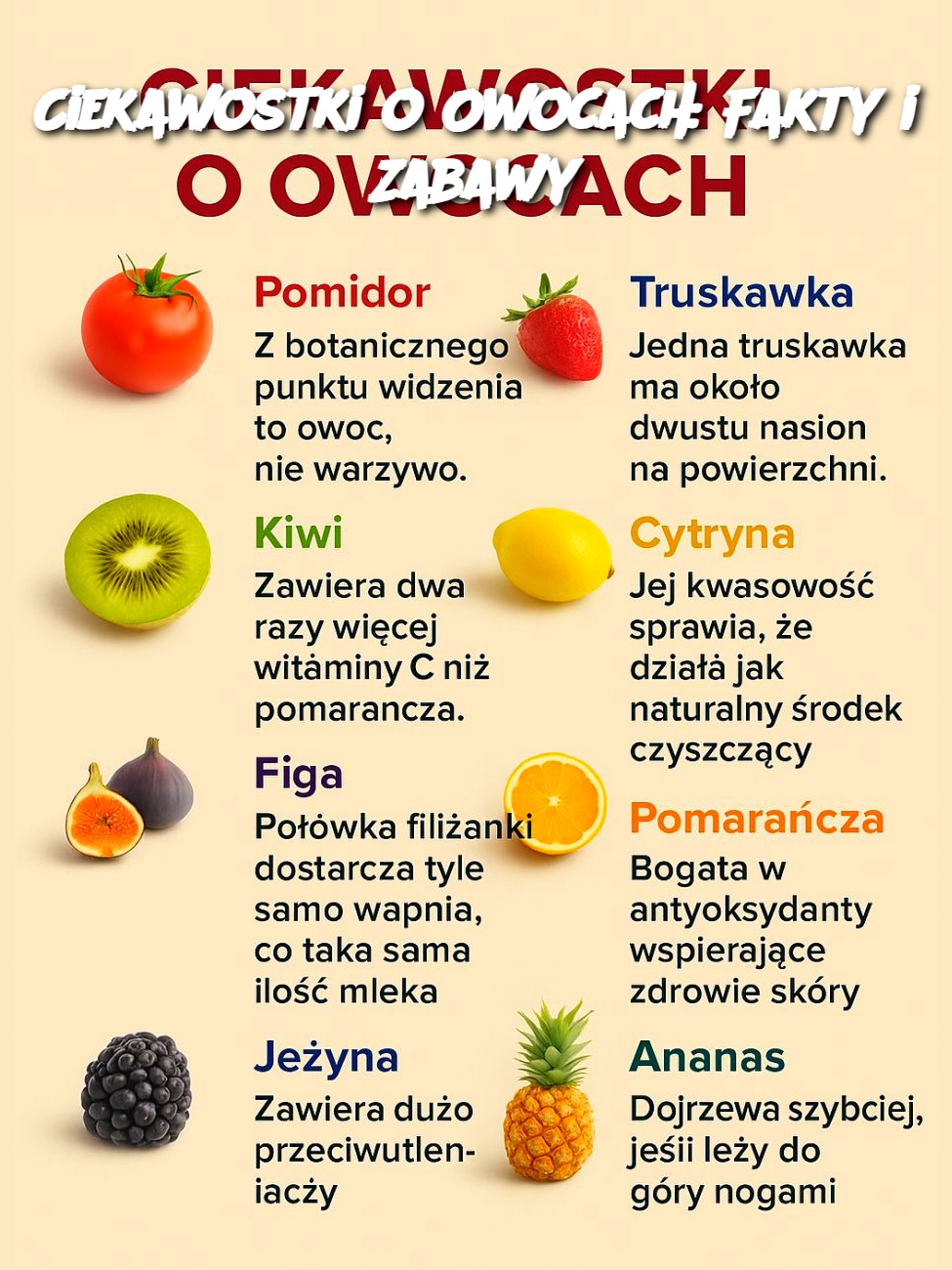 Owoce to nie tylko pyszne, ale również zdrowe i bogate w witaminy jedzenie. Każda porcja owoców przynosi coś nowego – od ciekawych faktów botanicznych do niespodzianek smakowych. Dlatego postanowiłem podzielić się z Tobą kilkoma fascynującymi informacjami o niektórych popularnych owocach, które na pewno Cię zaskoczą.
