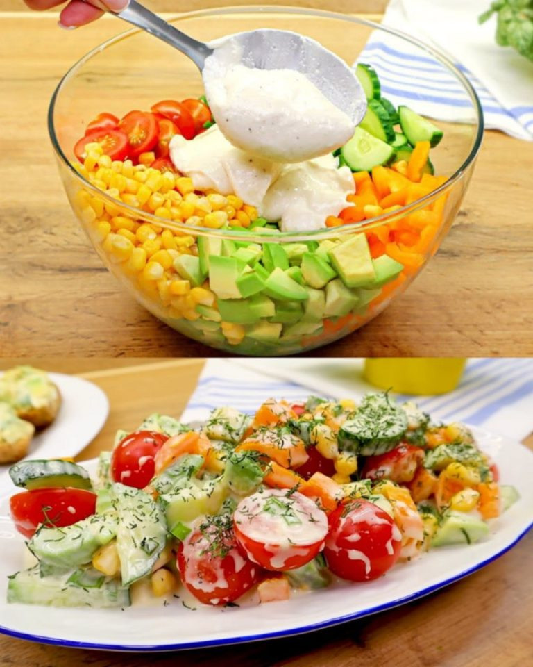 Kremowa sałatka z kukurydzy i papryki z awokado i pomidorami