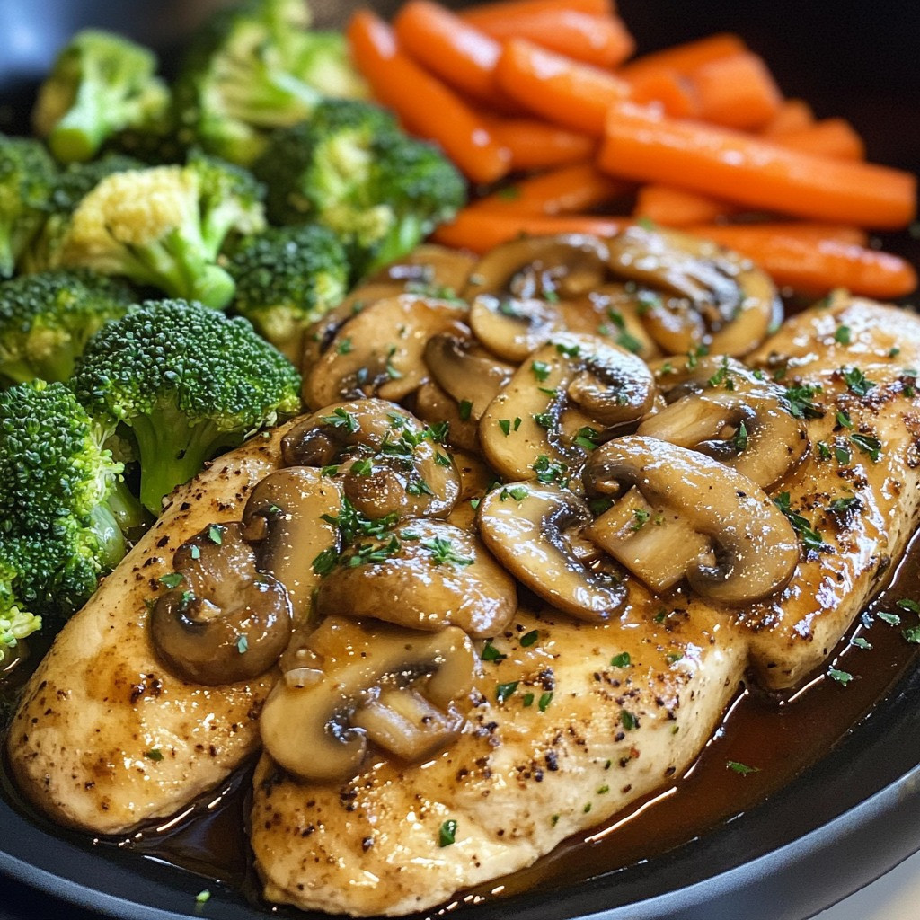 Kurczak z sosem grzybowym i warzywami gotowanymi na parze