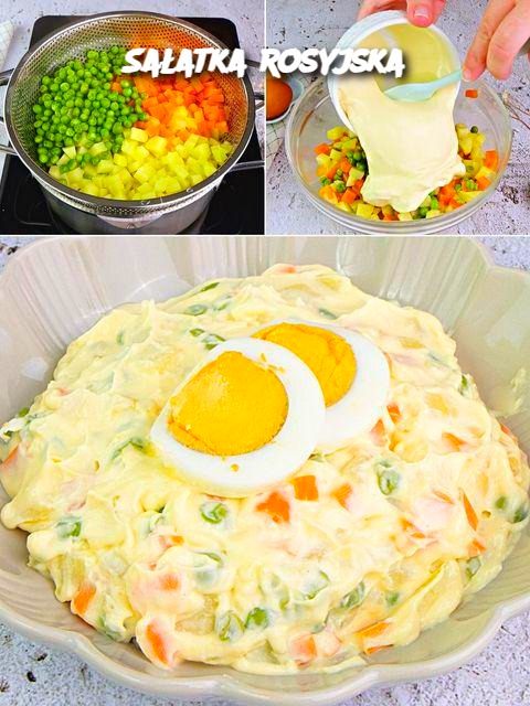 W garnku z gotującą się, osoloną wodą ugotuj marchewki, ziemniaki i groszek do miękkości (ok. 10 minut).