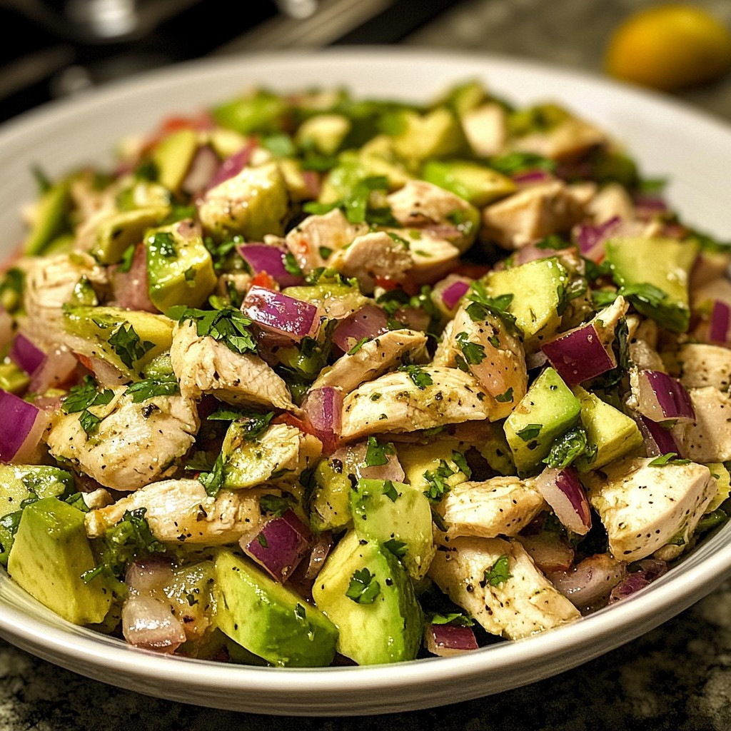 Połącz składniki sałatki: W dużej misce połącz pokrojonego kurczaka, awokado, ogórka, czerwoną cebulę i świeże zioła.